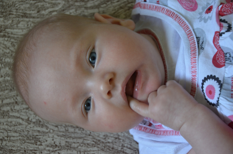 Зубы: слюни текут ручьем, все тянется в рот, десна немного покраснели. Но покраснение в районе клыков. Пока наблюдаю и грожу пальчиком, когда пытается грудь покусать деснами ))