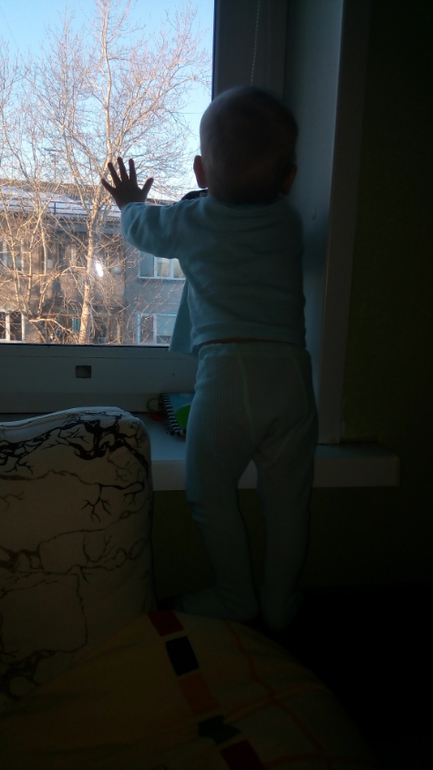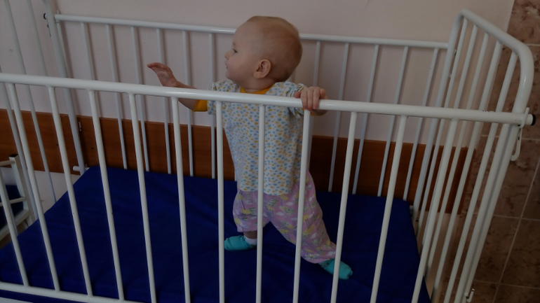 Когда ей стало получше - пустила для разнообразия поиграть в тамошнюю кроватку, ей надоело тусить или у меня на руках, или на нашей койке. Тут попрыгала, все облазила и осмотрела.