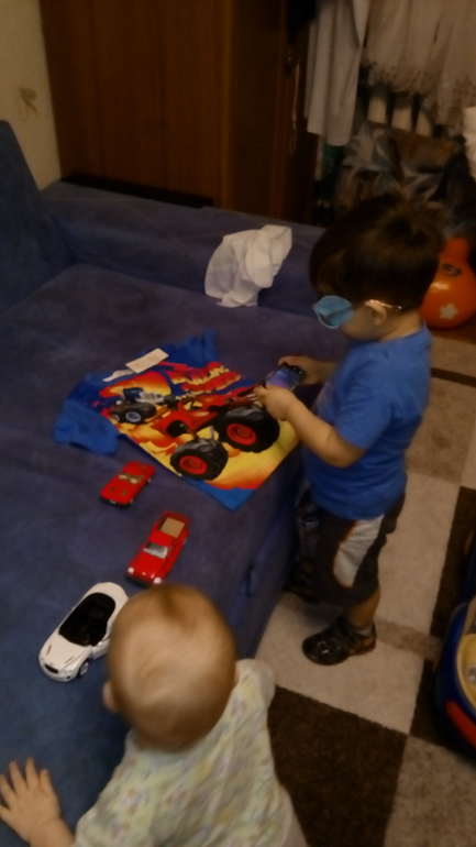 Но при этом начали играть вместе - катают машинки, складывают кубики в самосвал. Вместе прибирают игрушки и играют на муз. инструментах. Леша иногда просит покатать ее на машинке, сам двигается и просит, чтобы я ее посадила. Немного катает ее по квартире - Алиса довольна. Но чаще подъезжает к ней, чтобы она встала и ручками за спинку толокара взялась, а потом начинает потихоньку ехать, смотрит назад, чтобы она успевала за ним идти и так катается.
