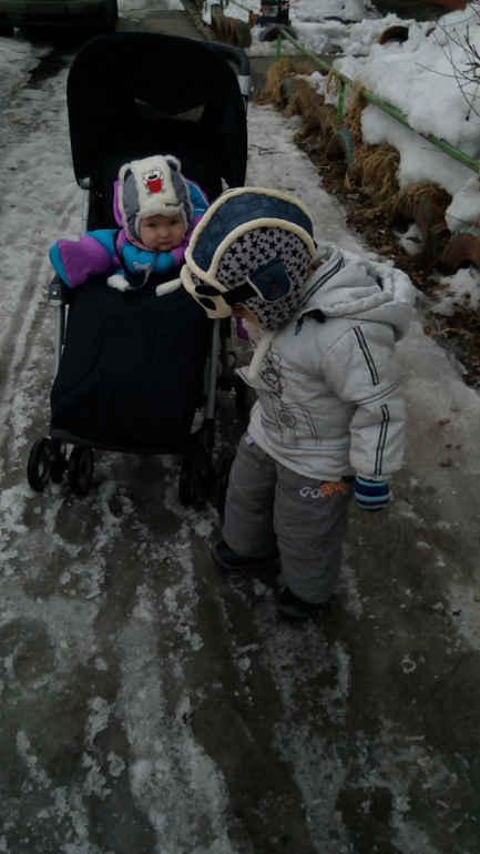 Гуляли в слинге, в конце марта папа привез нам нашу прогулочную коляску, которая хранилась у бабушки с дедушкой в гараже. Теперь мы катаемся в коляске. Ей нравится, можно и на братца посмотреть, очень внимательно следит за всем, что Леша чудит, и поспать на свежем воздухе. Гуляем рано. Детки рано просыпаются Алиса в 6.30, к 7:00 она будит меня и Лешу )) Около 10 мы уже выходим гулять.