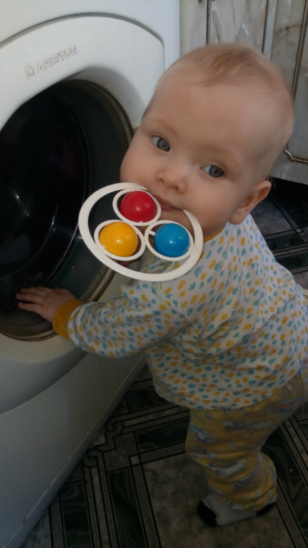 Координация движений и умение держать равновесие для ее возраста просто отличные. Я помню, как сын при любом падении ударялся головой, для Алисы это редкость, она шлепается на попу (группируется сразу). С удовольствием купается и брызгается вместе с братом. Пытается шагать вверх (у нас порог есть). Но потом опускается и переползает ползком. Если сын свалит на пол большую подушку от дивана - доча садится в центр подушки и раскачивается.