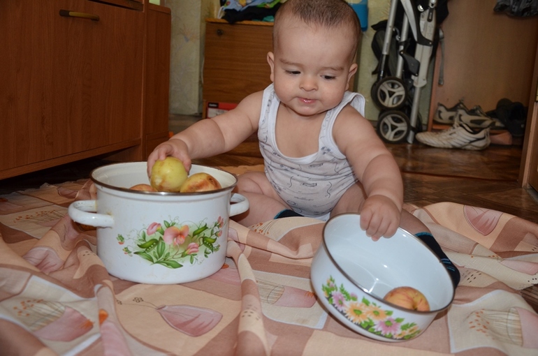 Дома: Играем со всем, что попадается под руку. Сделала домашнюю песочницу в кастрюле (манка и ракушки), играем с соленым тестом (злая мать дала попробовать на вкус.. долго отплевывался, но больше не тащит в рот :) ), пробовали играть со скорлупой, салфетками (рвать салфетки это так весело). Читаем книги, смотрим карточки с животными и выбираем из 2-3 карточек ту живность, которую я назову. Пробуем собирать деревянные вкладыши, пока научились только доставать их и не тащить сразу в рот. Ах, да, вылез 9-ый зуб, еще 3 явно на подходе!
