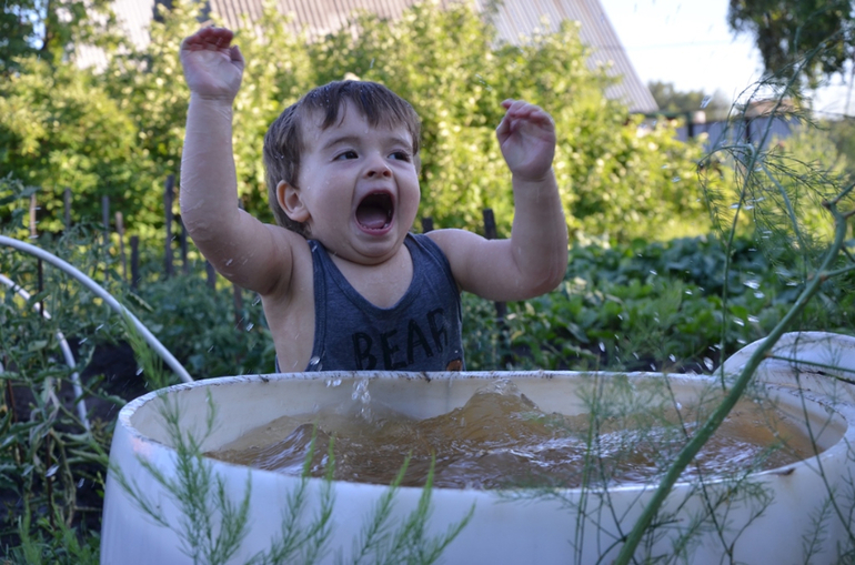 Ездили к знакомым на дачу, вот это счастье! Курицы, клубника, жимолость, качели, травка.. и можно бегать босиком! Ну, и конечно бочка с водой :)