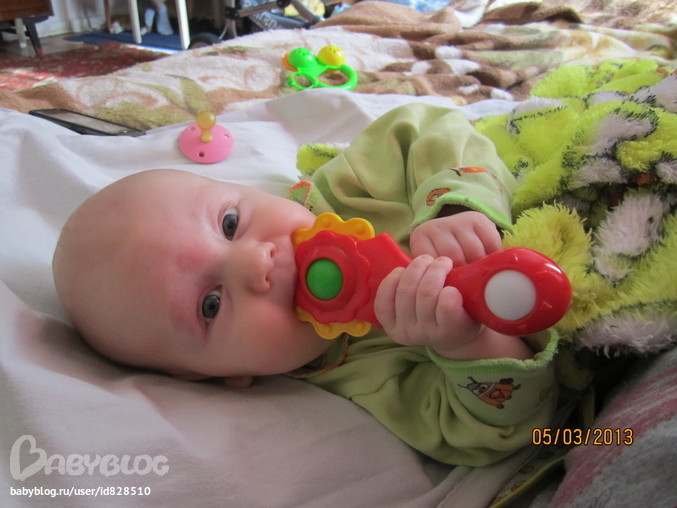 А уж погрызть что-нибудь это любимое дело... рубашка, пеленка, мамин или папин палец, все игрушки-погремушки, кулаки - все грызет... с соской и сиськой только проблемно последнее время... видимо ни соска ни сиська не массируют десна... Ждем зубов!!!!