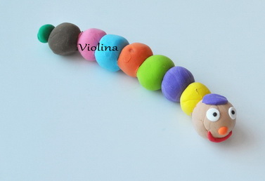 2. Гусеница - еще одна классическая первая поделка. Катаем шарики любых цветов, скрепляем их и делаем гусенице лицо (можно так же, как и колобку).