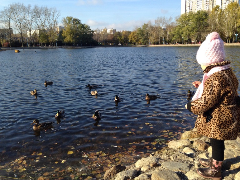 Вчера мы с ней сходили на прудик покормить уточек. Я ей давно обещала. А вчера погодка стояла солнечная, довольно теплая. Дашуля как всегда, съела, наверное, больше хлеба, чем дала уточкам. Нагулялись от души.