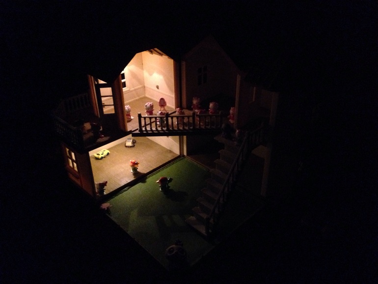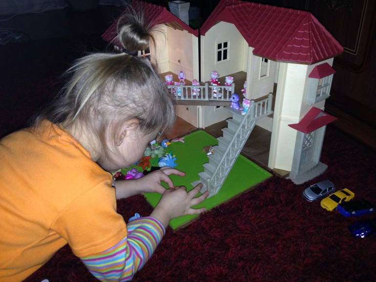 Вчера вечером мы им активно поиграли. Дашуля научилась сама включать и выключать свет в домике, поэтому играли в темноте. Вместо кроликов пока нашли несколько Китти из киндеров и других зверюшек.
