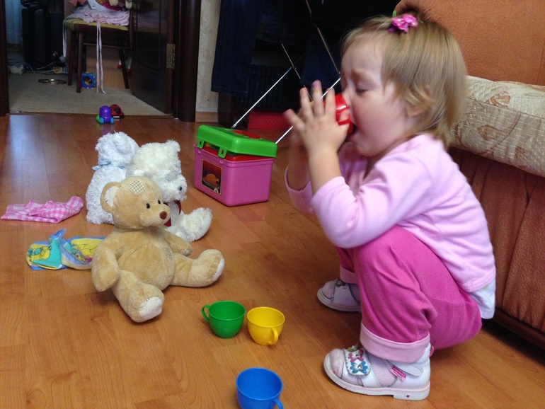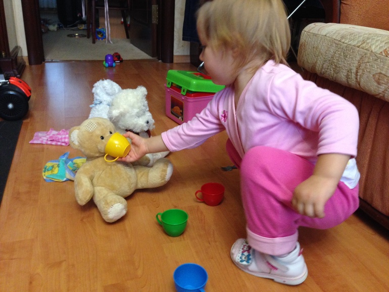 Делает вид, что пьет, а сама просто набирает в рот воды или чай и несет во рту в зал, где благополучно сливает все в одну лужу. Я в это время обычно на кухне варю, вот она и пользуется моментом. А я то думаю, ну пить ребенок хочет, подбегает, по глоточку пьет... Ха! Наивная! И ведь не один раз уже! Могла бы уже и понять ее тактику, но в который раз приходиться нести ей тряпку. Кстати, тряпкой она орудует всегда с удовольствием! Или достает игрушечную чашечку, наливает туда по капельке из той же бутылочки и пьет.