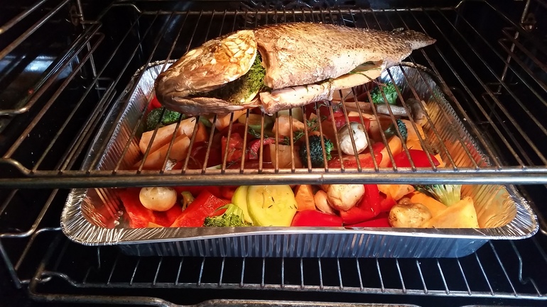 Пока подготавливала и нарезала овощи, рыба успела схватиться. Поменяла местами рыбу и овощи - рыбу поставила вниз. Через 15 минут снова поменяла местами рыбу и овощи - чтобы рыба зарумянилась, а овощи не сгорели. Еще 5 минут и готово.