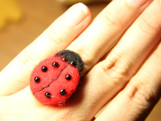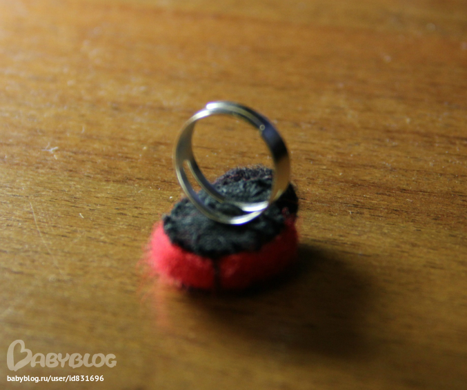 Ну а божья коровка - полноценное кольцо. С "изнанки" пришит кусочек черной джинсы и все пришито к заготовке для кольца.