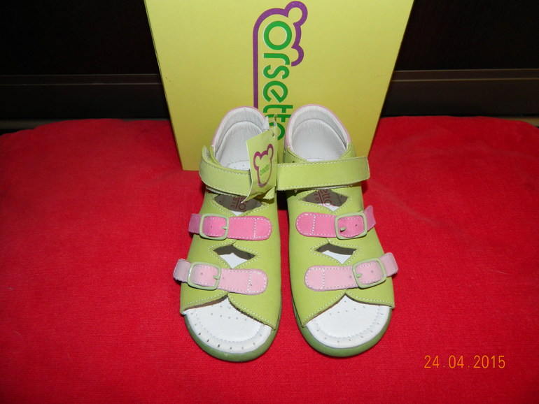 Босоножки/сандалии известной фирмы "Orsetto", пр-во Турция (не Китай). Цвет салатовый с розовым. Кожа на коже (сверху замша), жесткий задник, супинатор. 26 р-р, 15,7 см до края строчки, по края стельки 16,2 см. Абсолютно новые, с биркой. Цена 1900 руб.