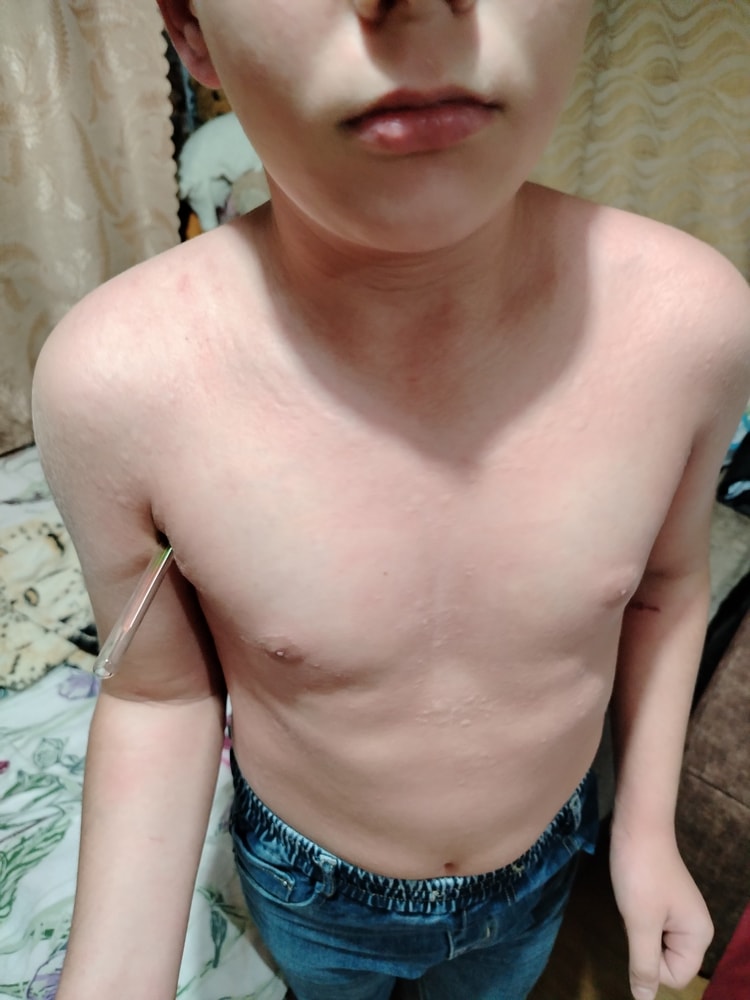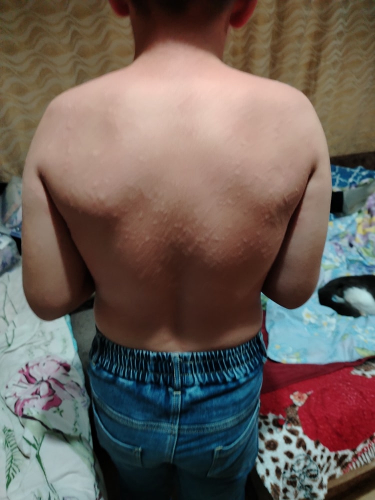 Во вторник вечером сел делать уроки. Закрутило живот. Пошёл, сходил в туалет. Пришёл снова сел делать уроки, почувствовал себя нехорошо, опять пошёл в туалет. В туалете его вырвало. Пришёл, говорит, мам, меня вырвало, а самого колотит, и лицо какое-то очень красное, причём не только лицо, но и "воротник". Я подумала, что от того, что вырвало сначала, потом смотрю, он белыми пятнами пошёл. Дала энтерофурил капсулу, нурофен, он сел с чашечкой, завернулся в плед и говорит, мама, посмотри спину мне, я что-то чешусь. Я вообще ни сном, ни духом, говорю, сейчас, может сосуды среагировали, достала градусник, подхожу, снимаю плед с него, а он весь вот такой: