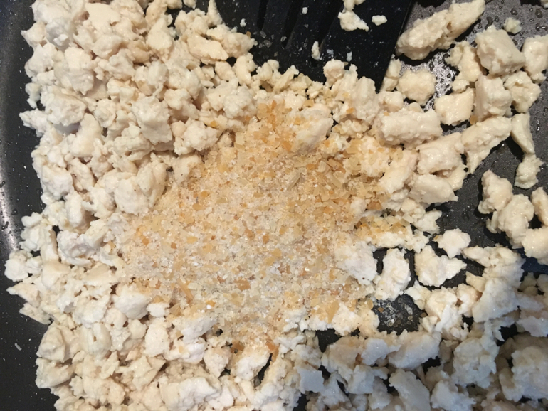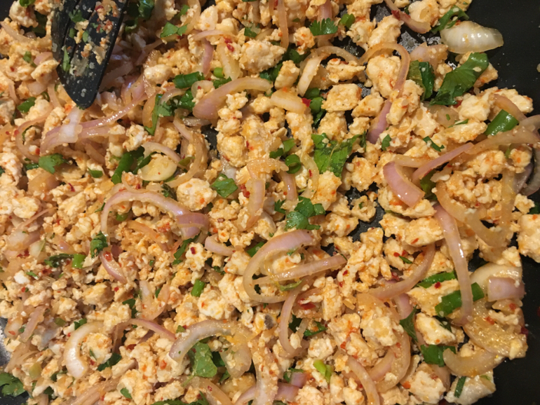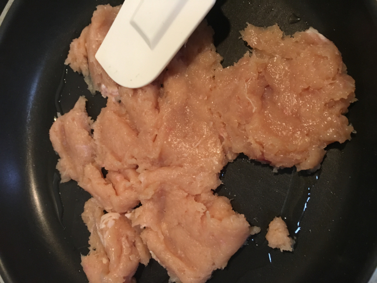 Пока резала лучок, курочка почти готова, разбить надо помельче, если комочки образовались