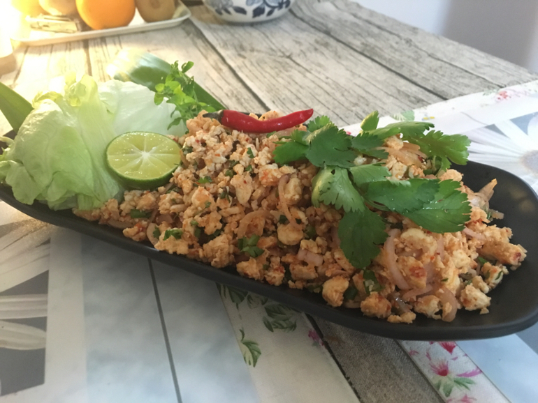 У нас был "тайский ужин" , поэтому этот салат был холодной закуской. На горячее Том ям и в качестве овощного салатика я делала салат с ананасами .