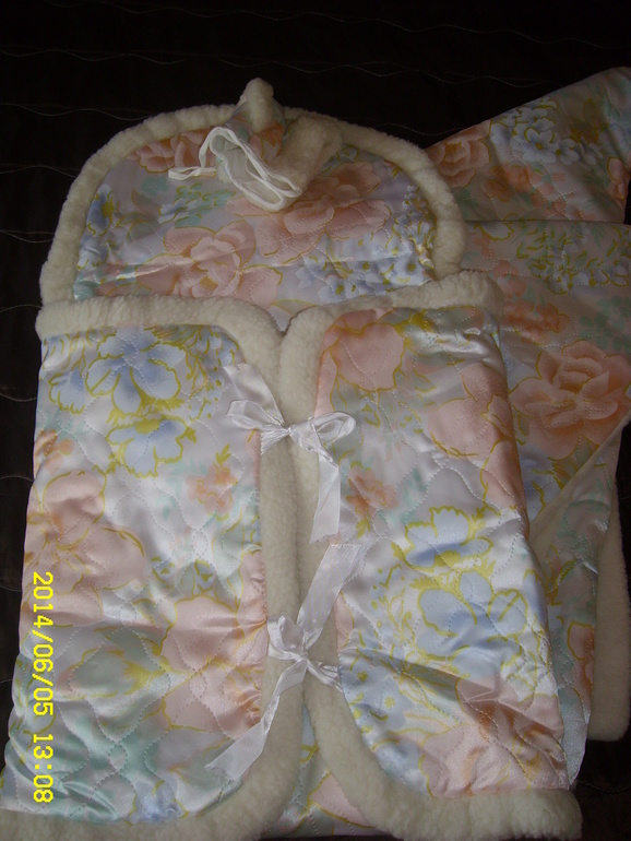 Меховой конверт на выписку+одеяло+шапочка.