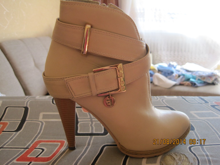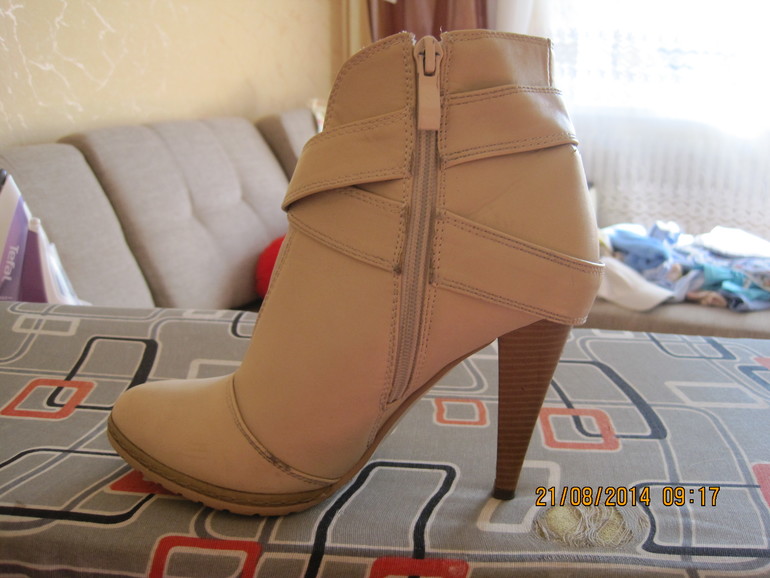Ботильоны осень-весна, цвет молочный с "золотой" фурнитурой. На ножке сидят очень красиво. Одевала раз 5-6. И то переобувалась на работе. Оказался не мой подъем((( Набойки металл, ставила сразу же. Высота каблука 10 см. Размер 36. Есть резиночка, хорошо пойдут на полную ножку. Но и на худенькой смотрятся не хуже. Цена 250р