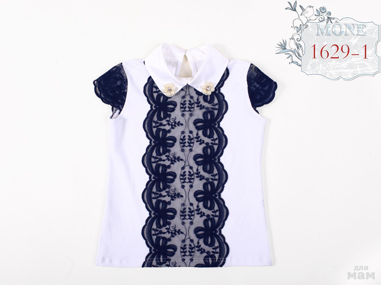 1629-1 блузка трикотаж, кружева синие, воротник атлас, жемчуг 122-151 белый , состав 5% лайкра 5% вискоза 90% хлопок цена 21,92