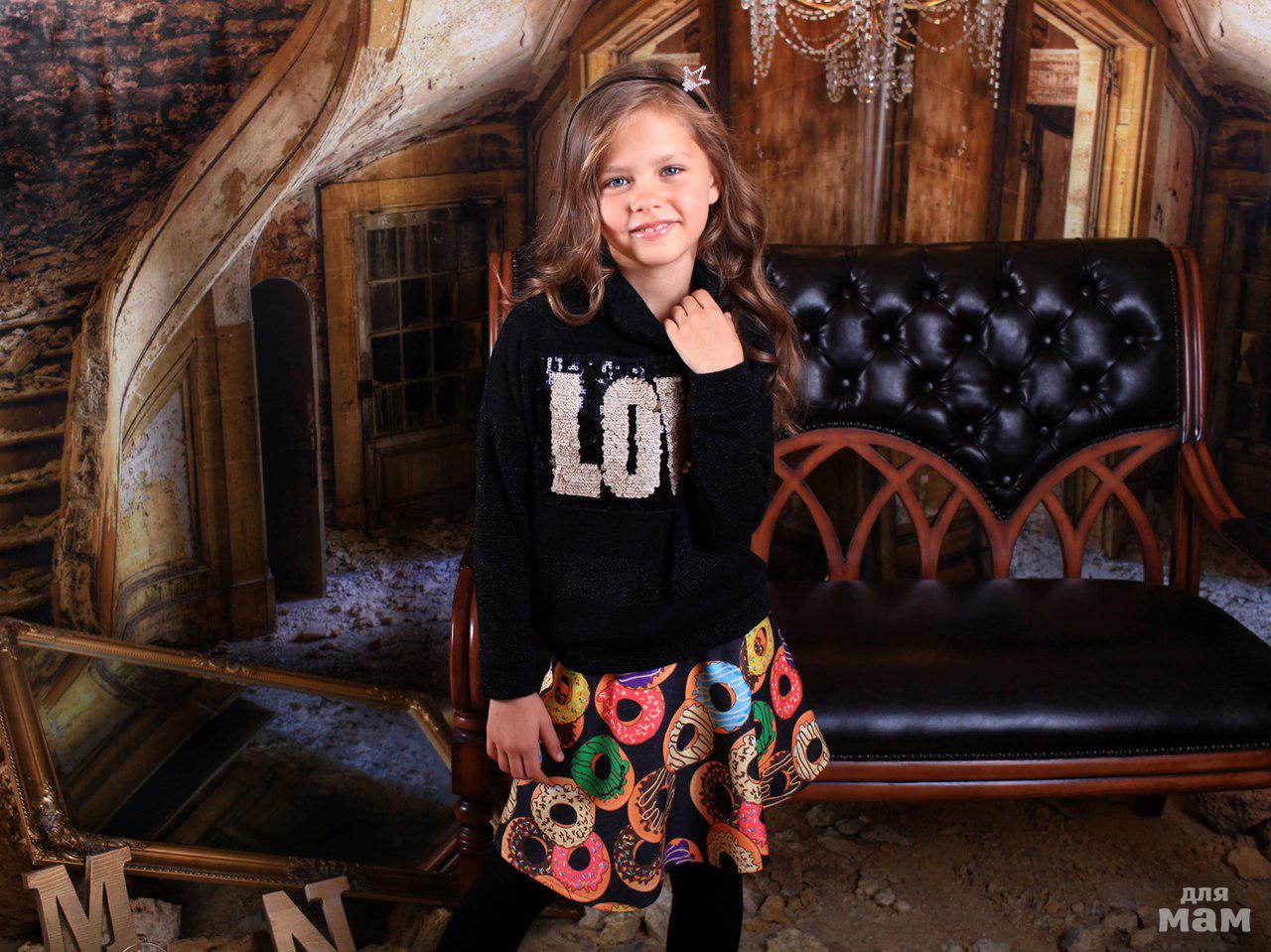1415-10 юбка трикотаж, Экопетля, принт пончик 1222-152 пончик, состав 60%хлопок 30%синтетика 10%лайкра цена 16,25+орг