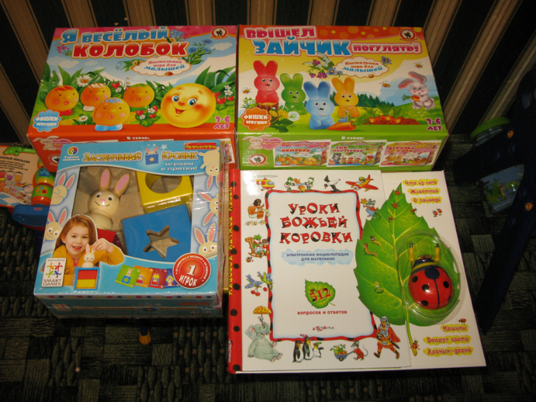 Настольная игра с фишками-игрушками «Я весёлый колобок». ФишкиЦель игры легко объяснить даже самым маленьким игрокам: чтобы победить, нужно первым прийти на финиш и правильно спеть победную песенку своего Колобка. Эта песенка должна включать в себя всех героев, которых Колобок встретил по дороге. Но это совсем не трудно, поскольку песенку игрок учит постепенно в течении всей игровой партии, ведь чтобы «уйти» от нового знакомого, Колобку нужно каждый раз перечислить в своей песенке по очереди всех героев, которых он встретил с начала своего путешествия. Карточки помогают проверить правильность событий. Это отличная тренировка для памяти. Но каждый ребенок развивается индивидуально. Если малышу будет слишком сложно запоминать героев на закрытых карточках, то в игре предусмотрена возможность временно облегчить ему задачу: не закрывать карточки персонажей, чтобы при встрече с новым героем ребенку оставалось только перечислить их. Через некоторое время можно снова вернуться к варианту игры с закрытыми карточками. В общем, правила гибкие и позволяют найти индивидуальный подход к каждому участнику, поставив перед ним посильную задачу.