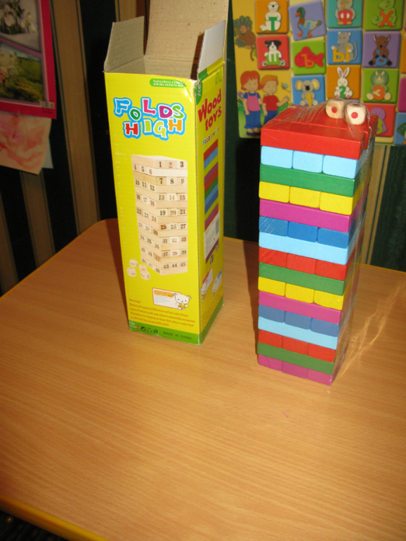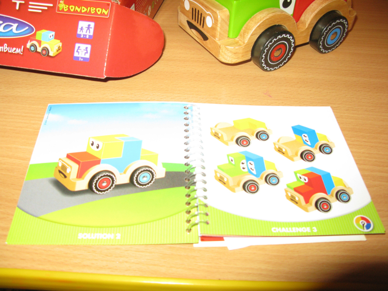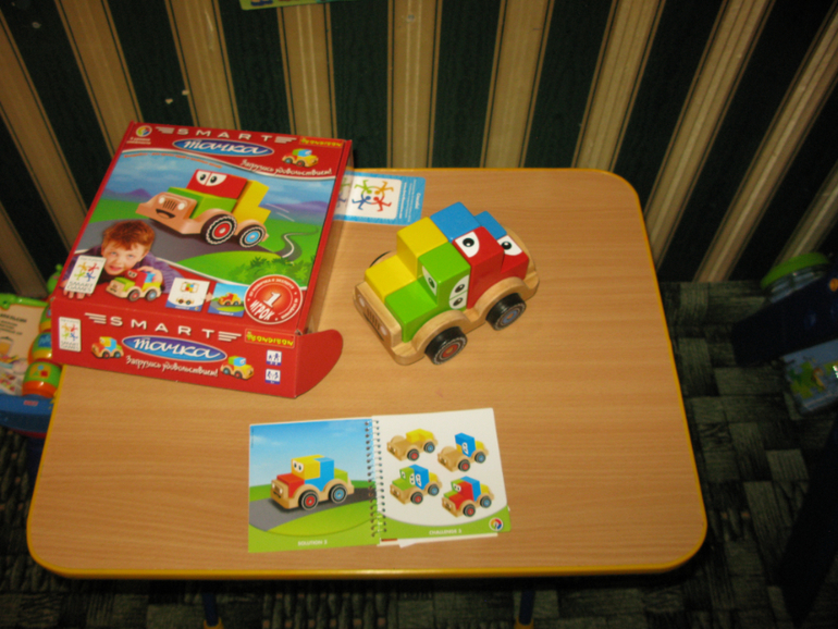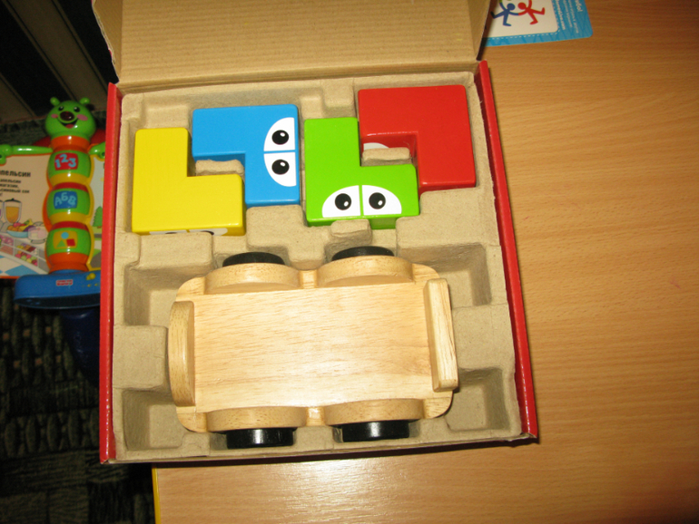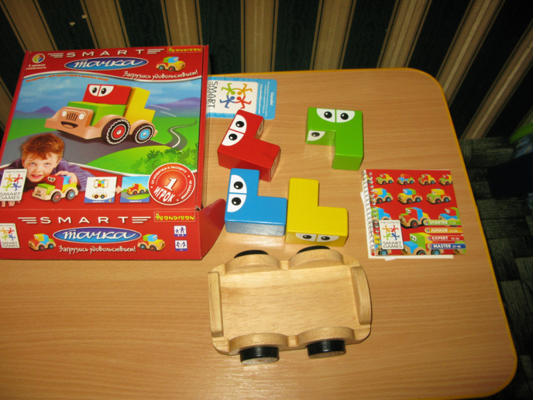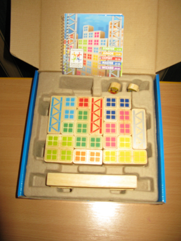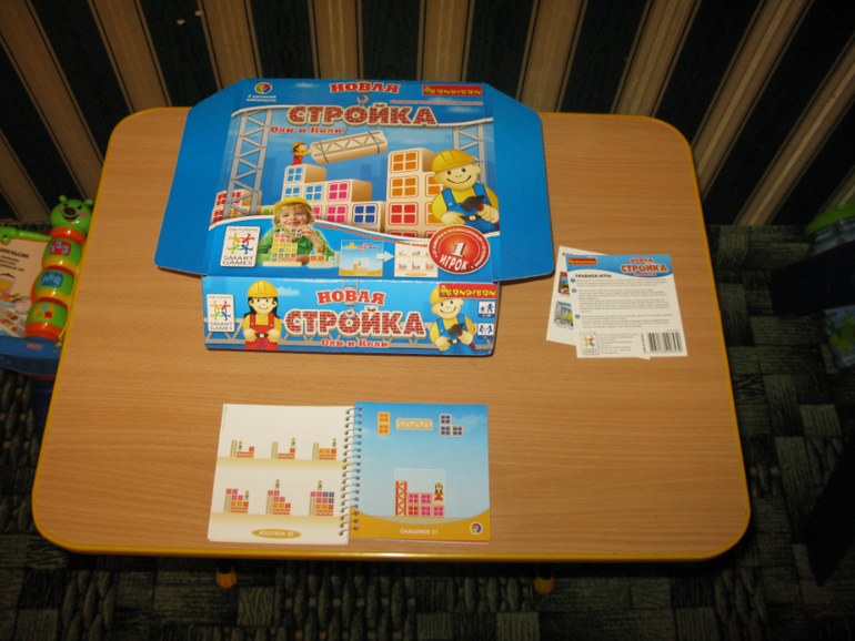 В комплект игры входят: буклет с 60 заданиями и ответами, 9 цветных деревянных блоков и 2 фигурки строителей.