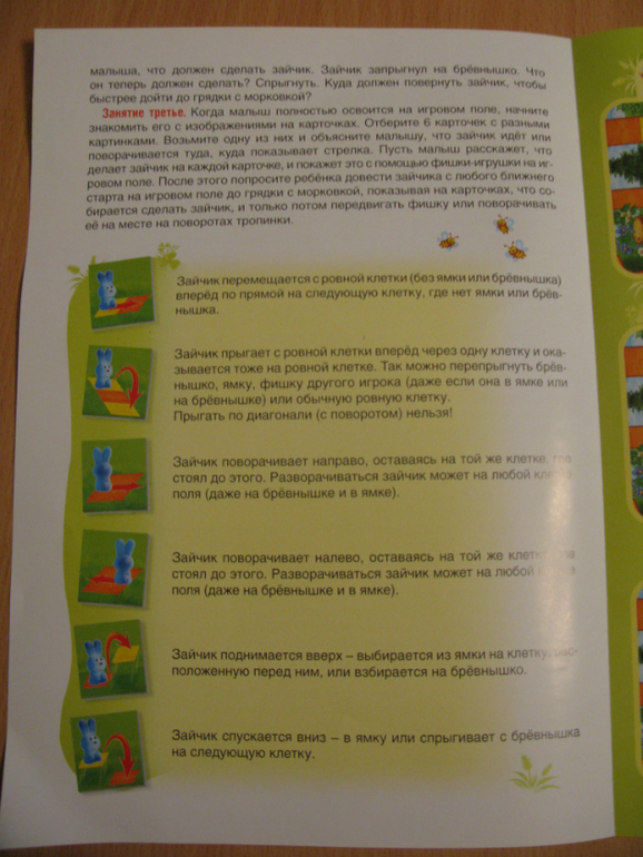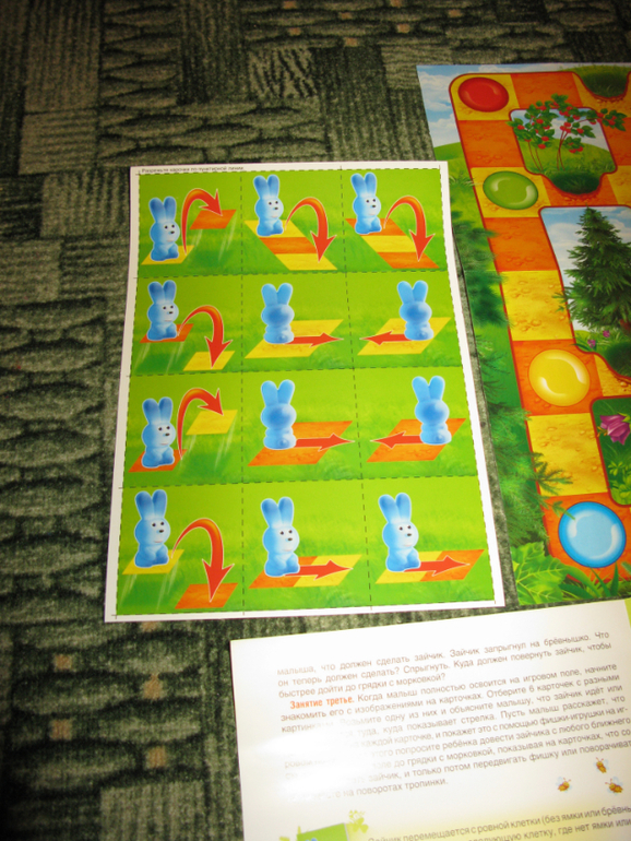 На красочном игровом поле изображен лес со множеством разделенных на клетки тропинок. Клетки, отмеченные цветными кружочками, являются стартовыми. Для самого простого и быстрого варианта игры используются ближние старты, расположенные в середине поля, а для более интересного приключения - дальние старты, расположенные на самом краю. Морковная грядка - это финишная клетка. Именно туда должен игрок привести своего зайчика, чтобы одержать победу.