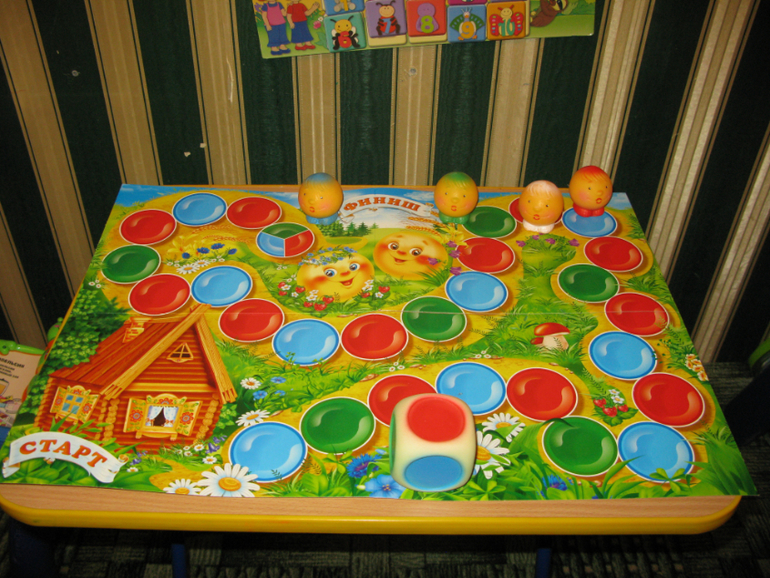 На игровом поле изображена дорожка от старта до финиша, состоящая из красных, голубых и зеленых клеток. По ней и путешествуют колобки - крупные раскрашенные вручную фишки-игрушки. Чтобы играть в эту игру, уметь считать совсем не обязательно. Для перемещения используется большой трехцветный кубик - какой цвет выпал, до такой клетки и катится колобок игрока. Во время игры активным малышам бывает трудновато усидеть на месте, а большой кубик из мягкой резины можно бросить куда угодно, даже в другой конец комнаты, попросив непоседу сбегать за ним и сообщить, какой цвет выпал. Это добавит игре баловства и веселья. И уж точно никому проглотить такой кубик не удастся. Игра не содержит мелких деталей и не представляет опасности даже для тех, кто всё тянет в рот.