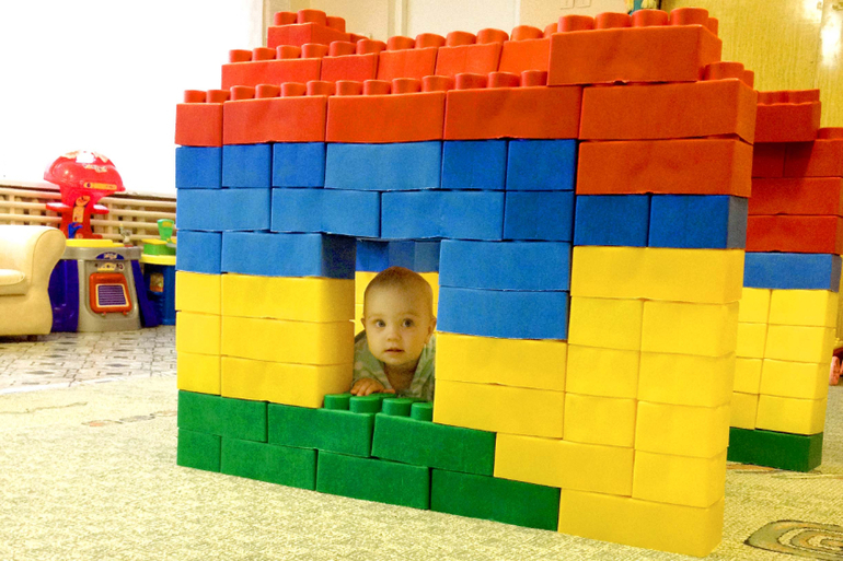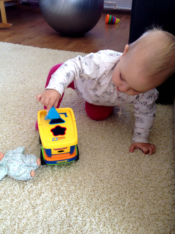 Юля стала активно интересоваться всевозможными сортерами, не всегда получается вставить фигурки, но старается!