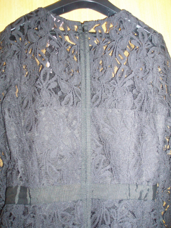 Размер 10 ( на российский 44-46). Состав 69 % хлопок, 2 % вискоза, 19 % нейлон. Подкладка 100 % ацетатный шелк. На талии вшитый корсажный пояс состав 70 % хлопок, 30 % вискоза. Верхняя часть платья впереди, сзади выше лопаток и рукава без подкладки - гипюр очень эффектно виден на фоне тела. Застежка сзади на корсажную молнию, которая гармонирует с поясом. Юбка солнце. На рост 160 - длина до колена.