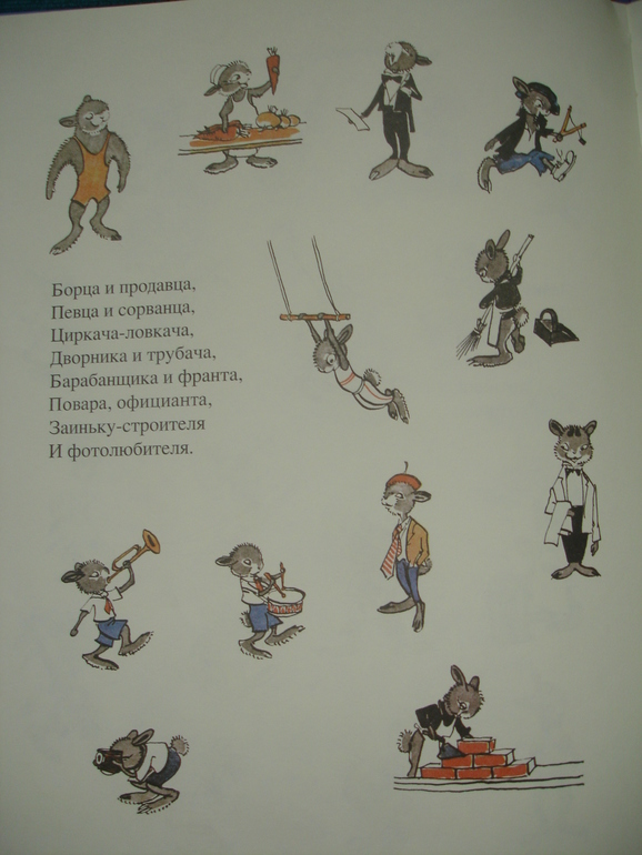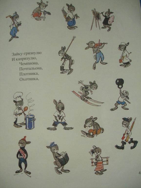 Потом подключились и остальные стихи, в том числе про Пик, Пак, Пока и овцу, а потом мы нашли "50 зайчат". И поехало...Это же почти как чижи! Загоняли мы их, читая по 7-8 раз подряд. Во тут не могу не посетовать. Читаем в тексте: "...барабанщика и франта, повара, официанта..." Зайчата вообще-то подряд идут, вот барабанщик, франт и официант: