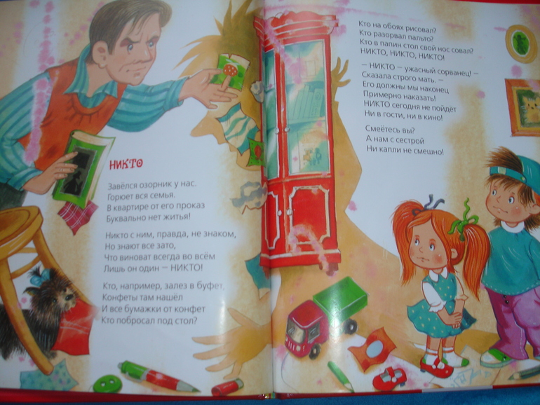 Ещё один любимый стих - "Па аааа" (сопровождается энергичным мотанием головой) - "про никого". Действительно, "виноват всегда во всём лишь он один - никто". Переделываю по ходу, читая: "кто все обои разорвал?". Рвать обои Саня уже пробовал, а рисовать на них как-то не додумался. Не хочу подавать идею. Вообще, этот стих вызывает какую-то бурю радости. Уже не первый раз замечаю, что шкодливые дети вызывают интерес. Например, плохая Оленька, которая "ногой толкнула кошку, на пол бросила картошку" вызывает желание подражать. Видимо, это сигнал, что "Маша и Ойка" нам в библиотеку не нужна. Честно говоря, она мне и не нравится.