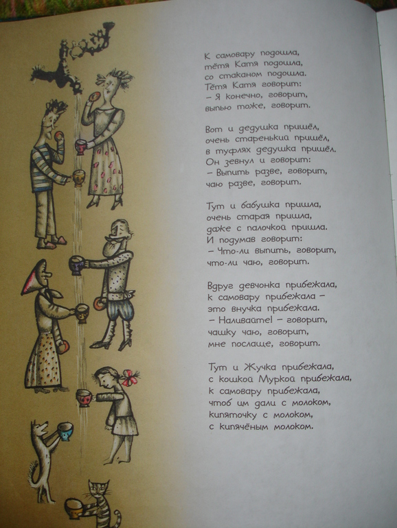"Иван Иваныч Самовар" читаем не с первой страницы (чем-то она Сане не нравится), поэтому у нас всё сразу начинается с того, что "К самовару подошла, тётя Катя подошла..." К моему удивлению, Саня и через 2 месяца помнил, что вон тот вот дяденька, который нарисован, но про которого мы не читаем, - дядя Петя. Так и заявил мне, ткнув как-то пальцем. В такие моменты я делаю выводы, что слушает он внимательно и запоминает.