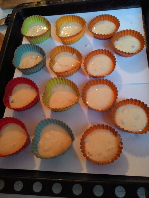 Смешиваем и раскладываем в силиконовые формочки на 2\3объема.Маленький секрет:Чтоб потом готовый кексик быстро выскочил из формочки и не прилип,ее надо ополоснуть перед заполнением ,холодной водой.На противень,под формочки я кладу либо пергамент,либо обычные листы бумаги