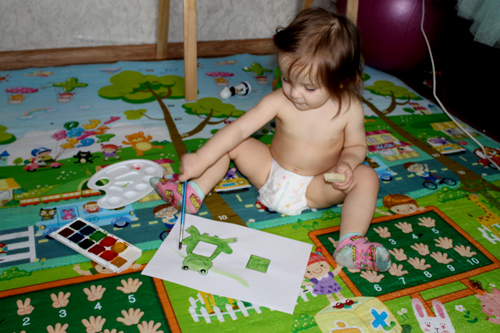 Я советую иметь две кисти,чтобы одной рисовали Вы,а вторую держал ребенок.Он обязательно будет повторять действие,которое делает мама.Нам на руку это)