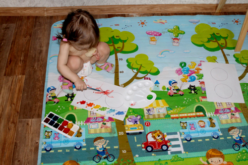 На пластиковую палитру мы капаем 6 цветов,согласно списку.Берем руку ребенка в свою,макаем в цвет,водим по картинке с контуром круга и палитрой."Рисуем" рукой ребенка каждый кружок своим цветом,объясняя,что круг может быть и желтым,и синим,и тд.