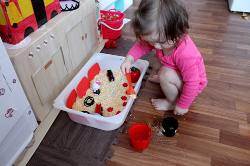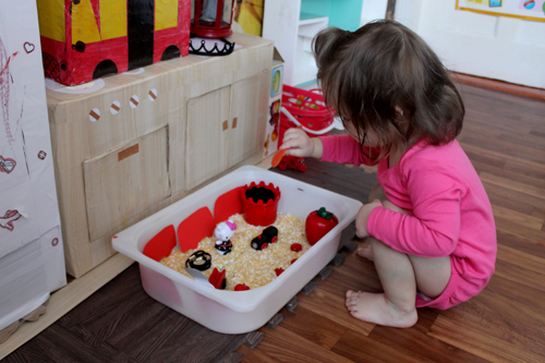 У нас там поселились мини - автобусы, машинки, яблочный сад, горка из шин. Мы катали машинки, оставляя следы, переводили кошечку через дорогу и пересыпали крупу ложкой в красно - черные стаканчики:
