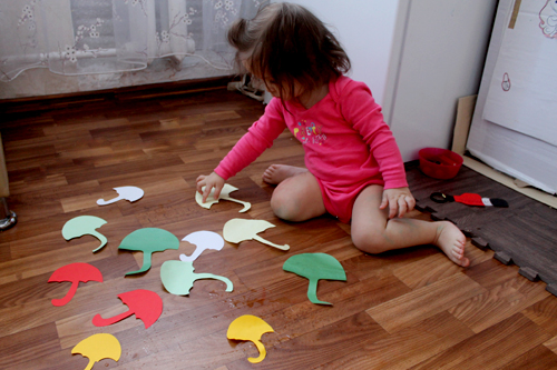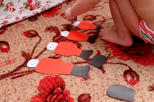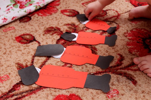Я солдатиков быстро склеила из цветной бумаги, и в процессе, появилась игра "Одень шапки солдатам":