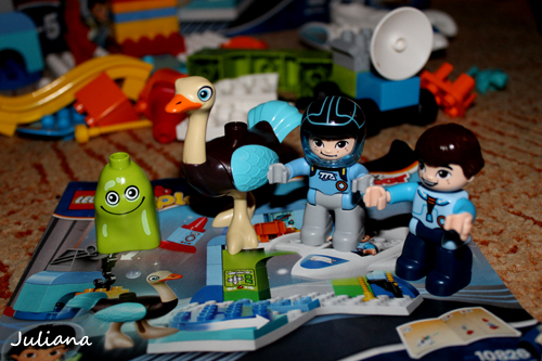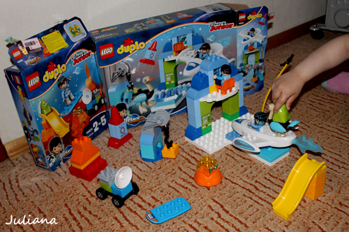 Я,вообще-то,уже на более мелкие наборы засматривалась,но сейчас понимаю,что ребенку пока удобно и интересно с Дупло именно играть.В рамках космических недель у нас появились два набора с Майлзом: