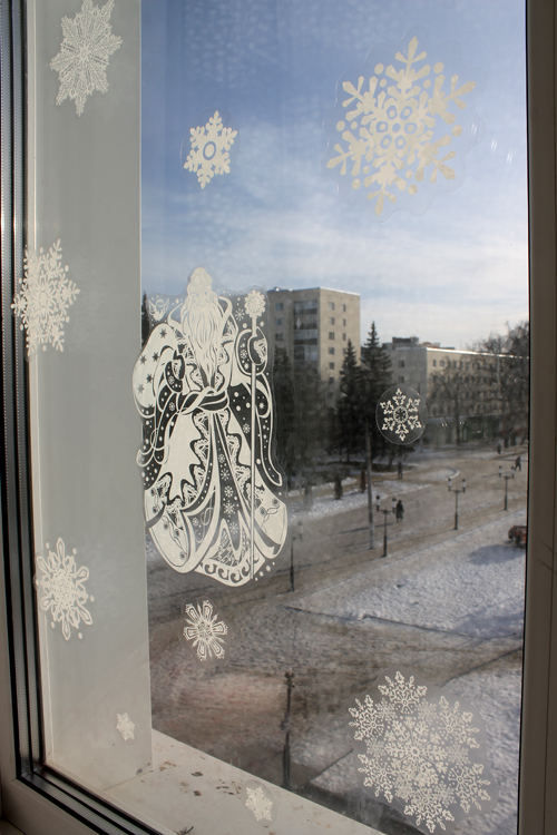 Украсили окна наклейками в этом году.Очень нежно получилось.Я покупала пачек 5 разных,все крутые:Дед Мороз,снежинки,олени,птички: