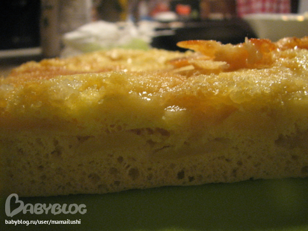 На карамель выложила 2 яблока, нарезанных на тонкие ломтики и залила тестом. Поставила в СВЧ на 6 минут. Потом добавила еще 30 секунд. Вкусно. Очень. И карамель сверху хрустит.
