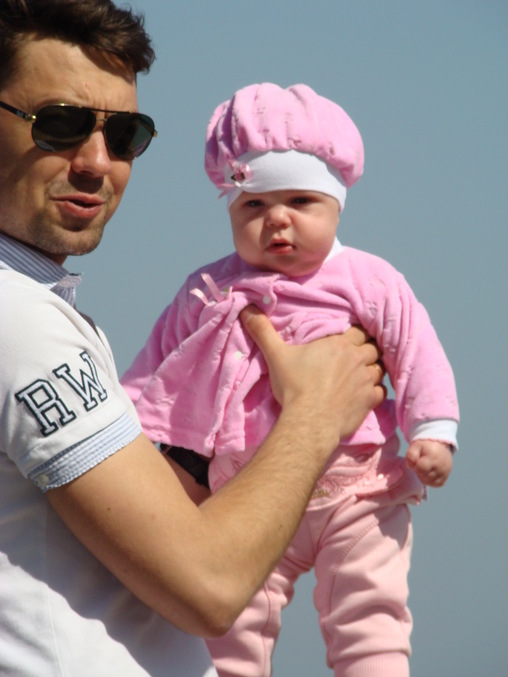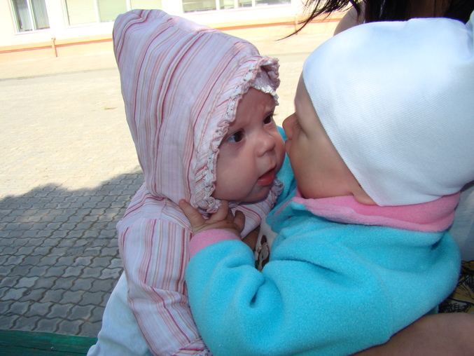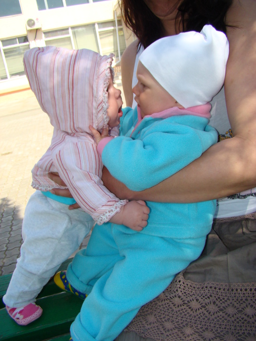 Через 4 дня нам уже 5 месяцев, ростет манюня скоро узнаем вес и рост , но выросла она прилично. Ввели прикорм , пока только яблоко , грушку, цветную капусту и персик .Каши невкакую , плачет и плюется (а я так хотела прикорм с кашек начать, но дивчина решила все сама).Научились топать ( держу за подмышки , а она пытается ходить ), пищим как не в себе ,а вчера Даниэлю задали выучить Русскую народную песню и танец , так они в 2 голоса выли....вчера ходили гулять к ДК встретили знакомую Анюту с сыночком Гришей , он постарше ему 8 мес, ну они друг от друга оторваться не могли в прямом смысле слова: