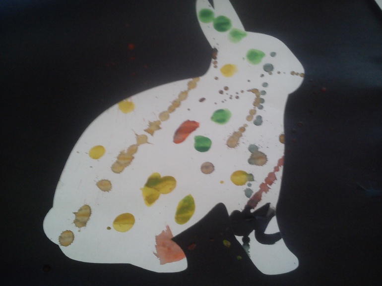 Разукрасили черно-белого кролика. Алиса придумала свой способ украшения - брызгала кисточкой. Получилось вот такое чудо: