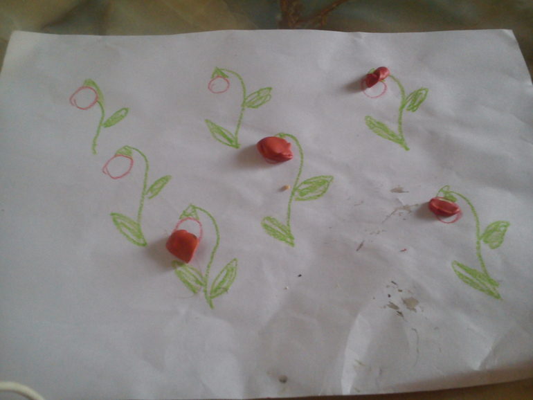 Алиса рассказала, что кушает и мы начали собирать малинку для него. Сначала использовали мозаику, потом Алиса приклеивала пластилин к кустикам, которые я быстренько за 2 минуты нарисовала. Ловили рыбку в пруду для мишки - использовали пластилин и деревянные шпажки. Сделали проводилку, но в лото почему-то не стали играть.