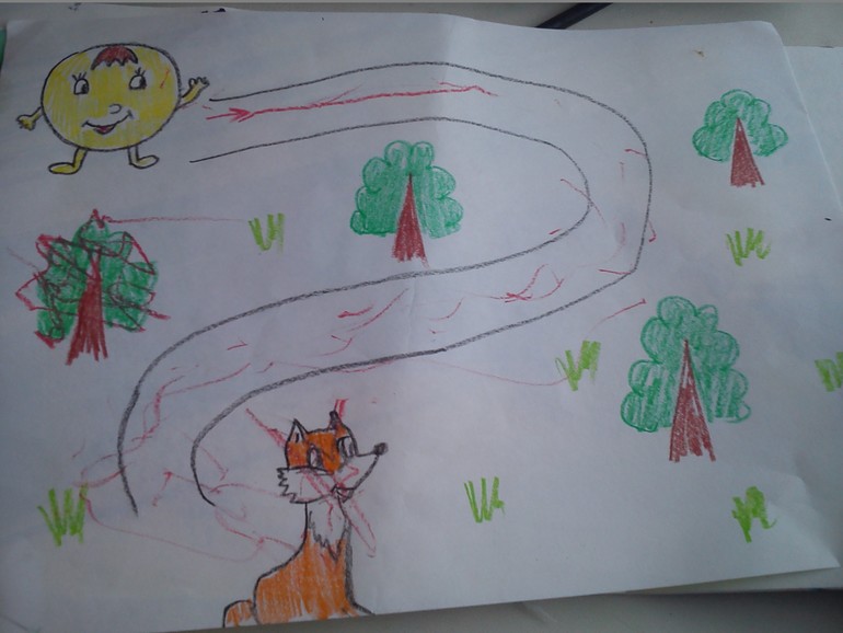 День 2. Разыграли сказку "Колобок" с помощью лего. Алиса ее знает уже наизусть, поэтому сама ее и рассказала. Попутно выполняли задания по просьбе героев сказки - угощали медведя ягодами (фишки мозаики), потом лепили ягодки для него из красного пластилина. Для лисы наловили рыбку (пластилин) и делали для нее чешую из блестящих пуговиц. Зайцу лепили оранжевую морковку - Алиса катала колбаски и приделывала к ним зеленые хвостики. Строили дорожку для колобка из лего. Сделали картонному солнышку лучики из разноцветных прищепок (желтых у нас столько не нашлось). Потом нам надоело сидеть и мы катали колобка друг другу. До этого я специально нарисовала на желтом мячике забавную мордочку. Алисе это очень понравилось и она, катая мячик, смеялась и пела песенку колобка.