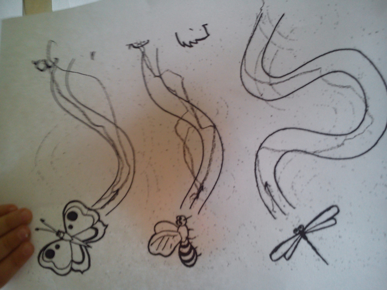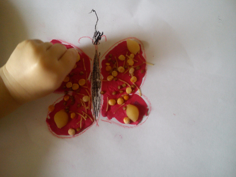 Расскажу вкратце о нашем дне. Насекомых мы специально никогда не изучали - просто смотрели на них на улице и говорили о том, что делают пчелы, где живут муравьи и т.д. Так что занятие было очень полезным. Начали с повтора насекомых, рассмотрели каждого, поговорили, чем они занимаются и чем друг от друга отличаются. Рассмотрели цикл жизни бабочки. Потом я вспомнила стишок про маленьких кузнечиков и мы попрыгали немного по комнате. Вообще я заметила, что Алисе каждое "сидячее" задание надо сменять активным. Иначе у нее терпения не хватает. Выполнили проводилки, с тенями справилась хорошо. Там, где был пунктир, она тоже нарисовала пунктиром. Но я возражать не стала. Разложили лото - ошиблась только один раз. После лото попросила, чтобы я нарисовала ей "божную коровку". Алиса потом ставила на ней точки ватной палочкой и пальчиками. Потом снова подвигались - летали как бабочки. Домашние предметы мебели были для нас цветами. Потом поиграли в пчелок. Это подвижное задание я где-то когда-то читала и мы его даже практиковали. Я расставила в одном конце комнаты разноцветные "ульи"-чашки и ведерки. На диване мы собирали мед - фишки от мозаики. Нужно было ложкой аккуратно перенести "мед" в нужный по цвету улей. Я была поражена, но у Алисы терпения хватило на все фишки. Потом мы делали бабочку. Размазали пластилин, а потом я ей выдала макароны и крупы, и Алиса их вдавливала. Сказала, что подарит папе) Бабочку из палочек не стали составлять, не захотела дочка. Сделали из блоков Дьенеша.