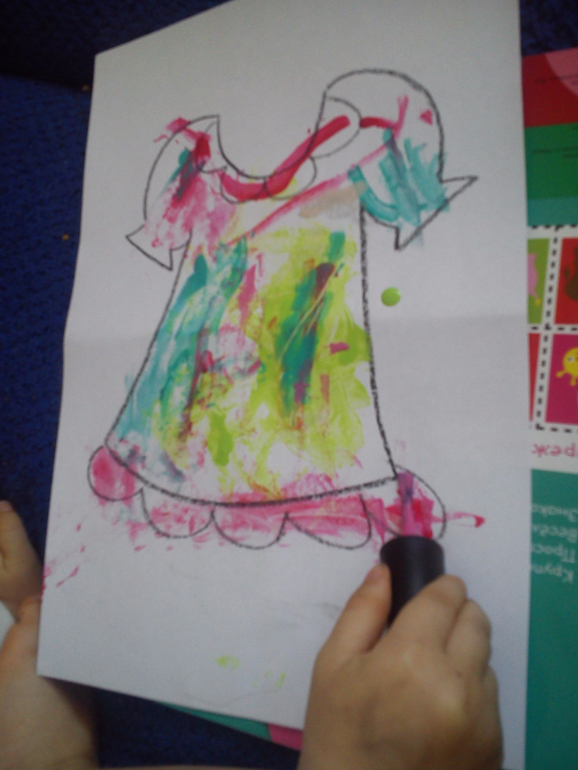 На 7 день мы повторяли все, что знаем об одежде. Называли предметы одежды, поговорили о сезонной одежде и о том, из чего ее делают. Алиса попросила, чтобы я придумала для нее сказку про куртку) Потом выполнили печатные задания. С заплатками Алиса справилась легко. Особый восторг вызвала бумажная кукла с одеждой. Алиса сказала, что она похожа на меня:) "Волосы рыжие, как у тебя", - объяснила она. Девочке Алиса дала сложное имя Лиза-Клубничка. Алиса ее одевала и раздевала в зависимости от погоды. Потом она придумала, что Лиза-Клубничка гуляет по лесу и встречает разных зверей. Довольно долго играли таким образом. Потом мы всех своих человечков-лего одели в пластилиновые одежды. Раскрасили платье. Каюсь, дала ребенку свои старые лаки. Она очень захотела, а я подумала, что большого вреда не будет, потому что я рядом. Пахло, конечно, ощутимо, но зато радости было море. В заключение я дала Алисе ворох носочков, а она собирала пары из них. Потом мы их развесили на веревку с помощью прищепок.