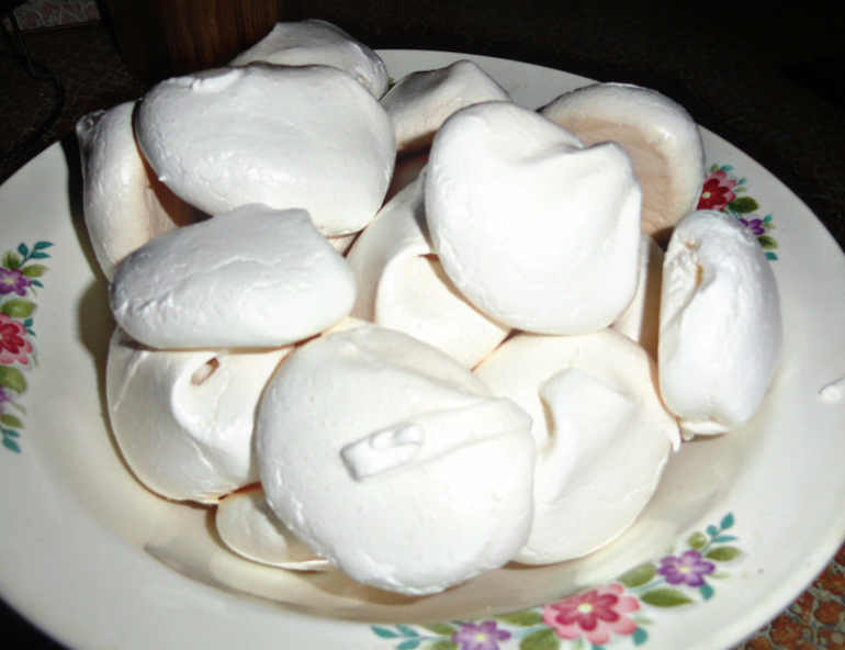 4 белка,280гр сахара(наверное,можно пудрой заменить) и лимонная кислота на кончике ножа.