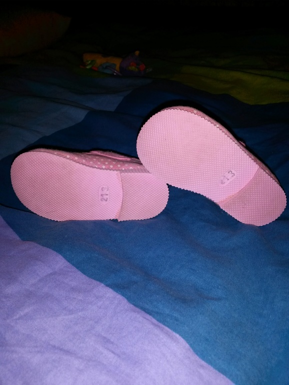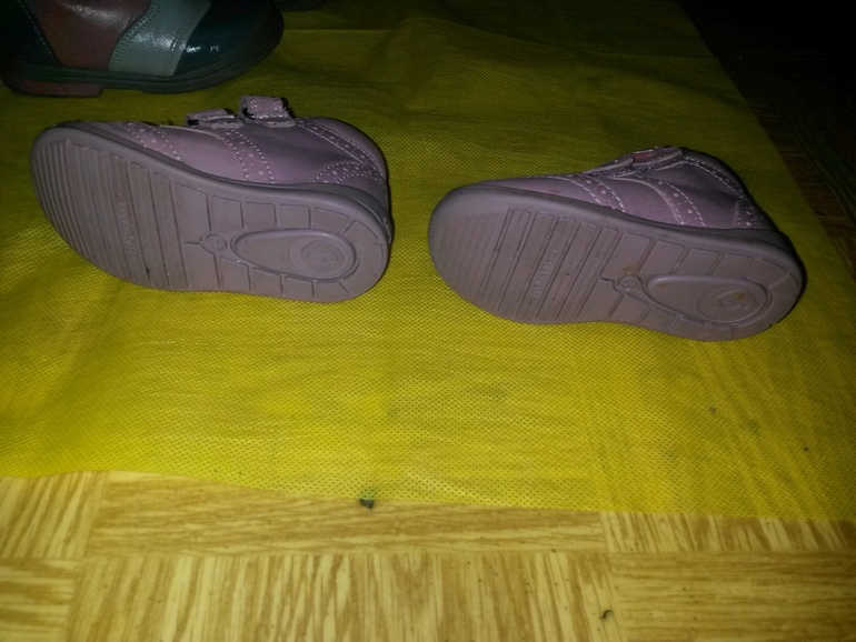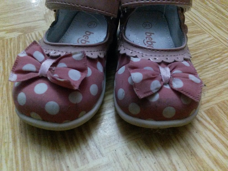 1 ) Туфельки светло-розовые в горох с бантиками. Тканевые, но жесткие, настоящие туфли, внутри кожа. Состояния новых, одели 2-3 раза на улицу, из-за чего последствия - поймали траву, чуть осталась зелень на мысах, заметна только при близком осмотре. Внутри кожа.