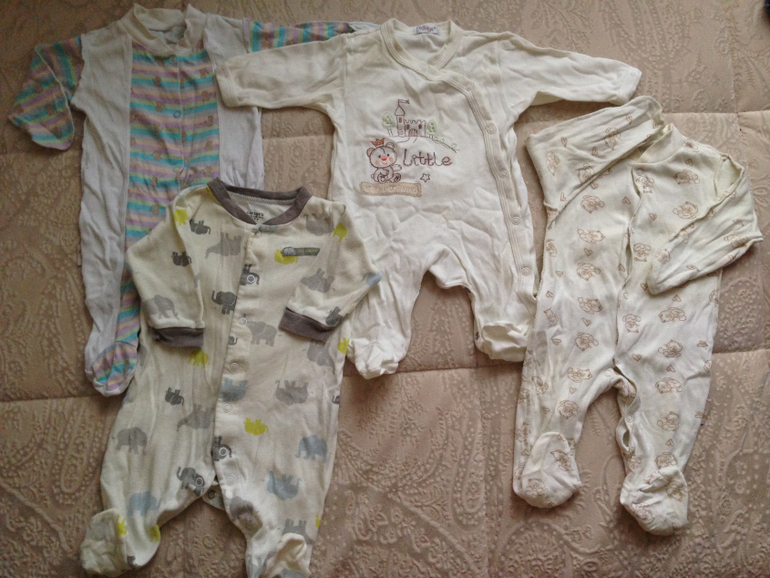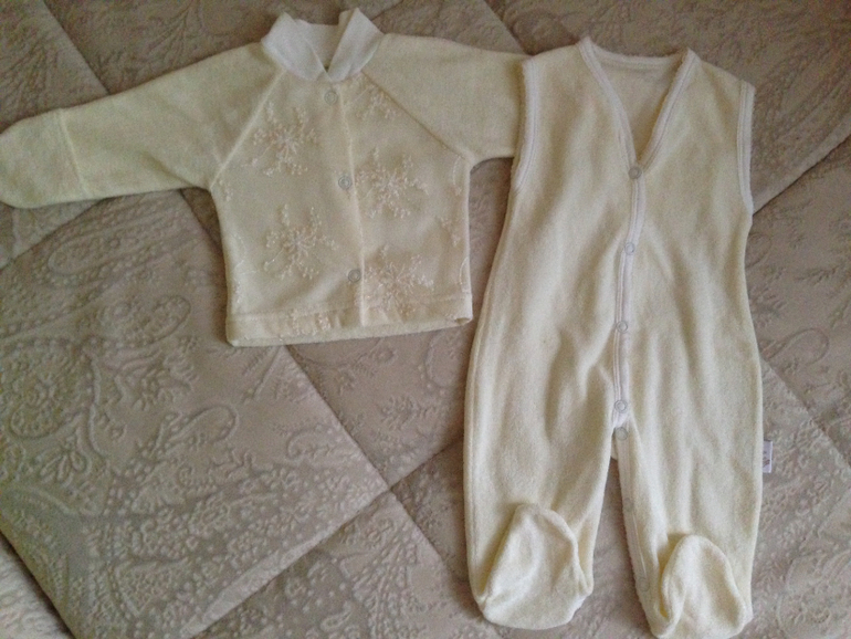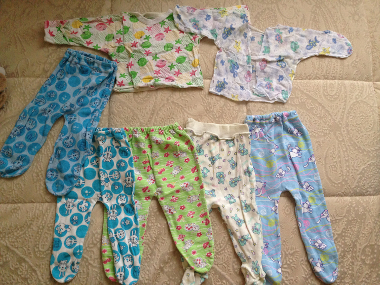 30. Набор пеленки (14 тонких и 4 байковых), 7 марлевых подгузников, 5 распашонок, 5 ползунков и 7 чепчиков. За все 2500 руб.
