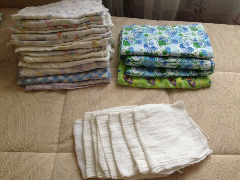 30. Набор пеленки (14 тонких и 4 байковых), 7 марлевых подгузников, 5 распашонок, 5 ползунков и 7 чепчиков. За все 2500 руб.