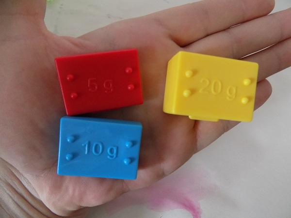 В наборе два вида грузиков - пластиковые плашки и металлические гири, как у аптекарских весов.